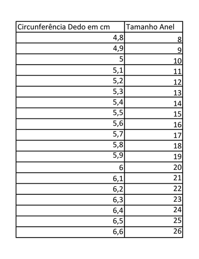 Use a tabela de conversão abaixo: Compare o valor da circunferência com a tabela para descobrir o seu tamanho de anel: