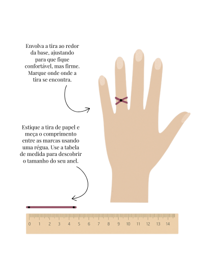 Desenrole a tira e meça: Estique a tira de papel e meça o comprimento entre as marcas usando uma régua. O valor obtido será a circunferência do seu dedo em milímetros.